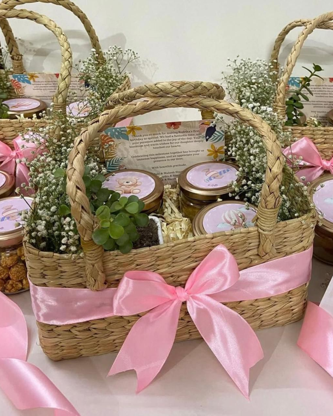 Rustic Woven Gift Basket with Pink Bow