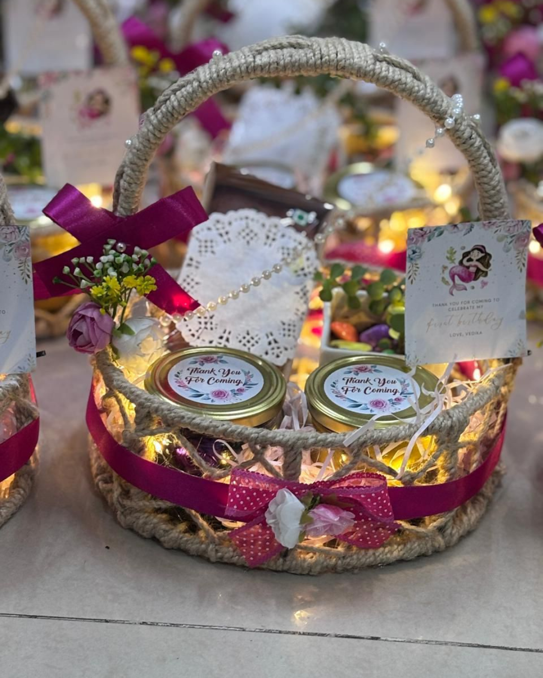 Celebrate your special moments with this handcrafted jute rope gift basket, adorned with vibrant magenta satin ribbons, pearl-detailed handles, and fresh floral accents. Thoughtfully packed with jars, treats, and thank-you notes, this basket is a charming choice for birthdays, baby showers, weddings,
