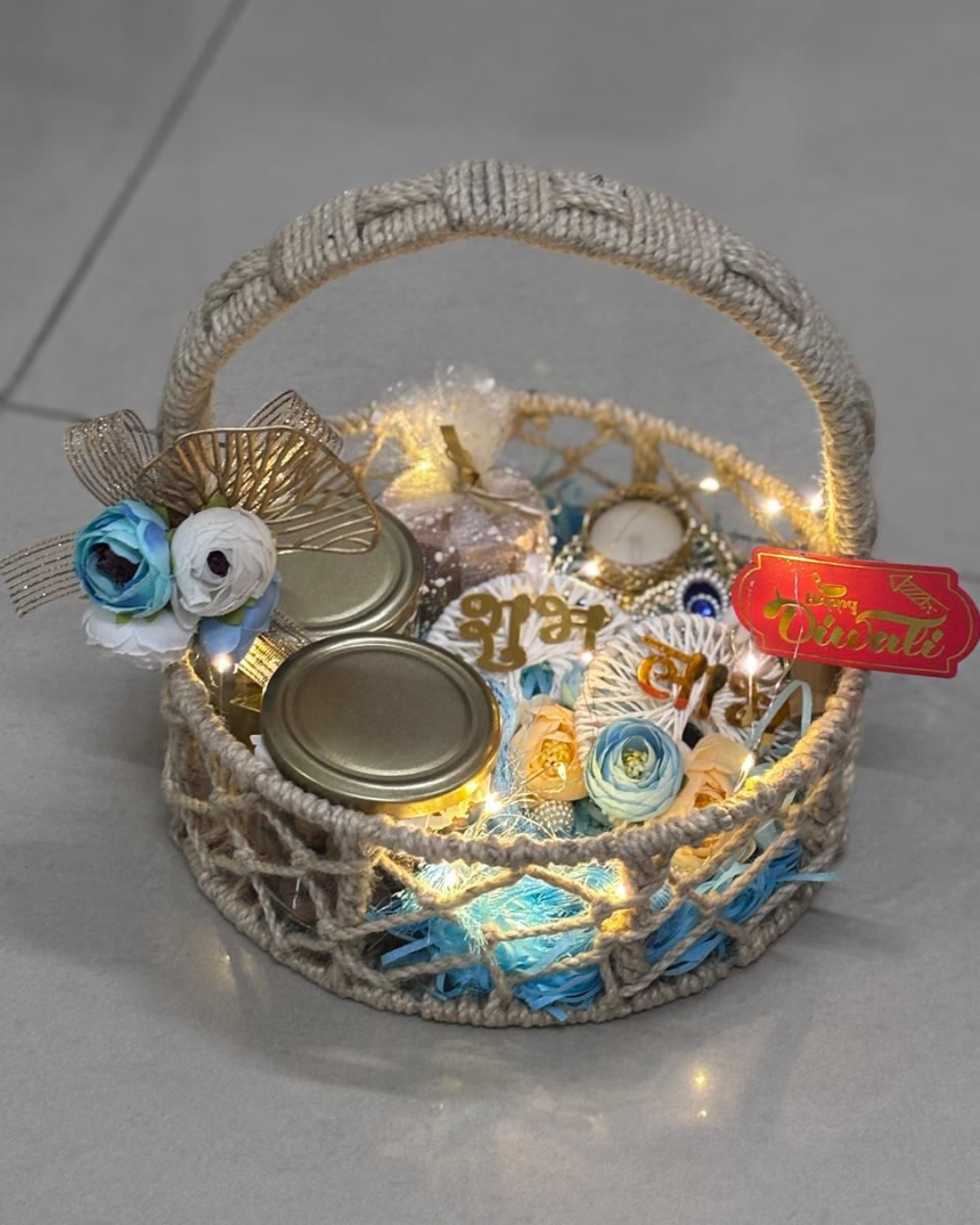 Light up your celebrations with our handcrafted jute gift basket, beautifully decorated with fairy lights, floral accents, and premium jars. Designed in a rustic woven style, this basket blends tradition with modern elegance, making it ideal for Diwali gifting, weddings, and festive hampers. A thoughtful